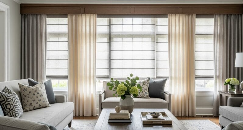 Woven wood shades or layered fabrics bring warmth and depth to the room.